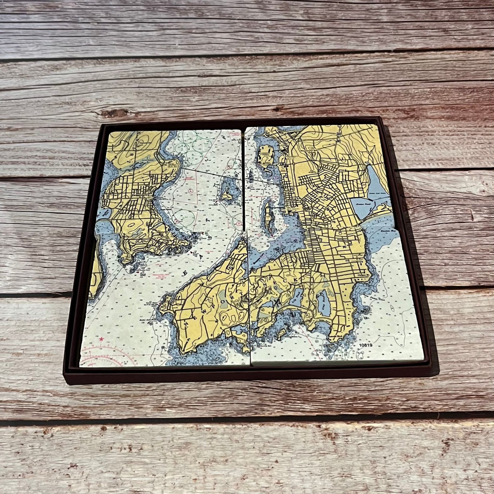 Our stunning set of four marble tile coasters feature a beautiful chart map of Aquidneck Island. These coasters are the perfect reminder of relaxing days spent in the City-by-the-Sea, adding a touch of elegance and sophistication to any decor whether in the living room, dining room or a home office.