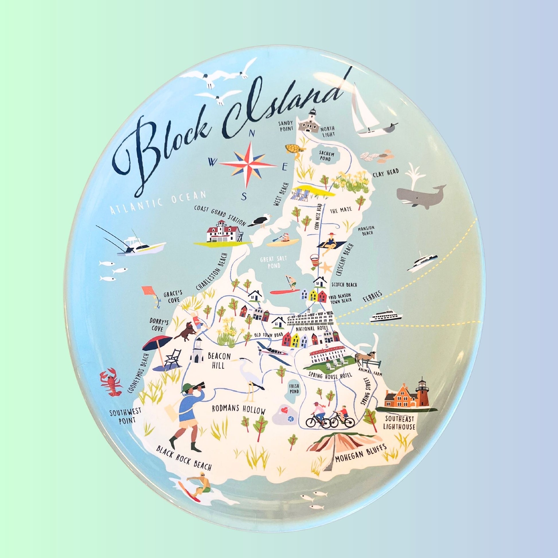 This Northern Shores large platter is a beautiful and practical addition to your kitchen! It features an artistic rendering of Block Island’s most famous landmarks, from Mohegan Bluffs, Black Rock Beach, Crescent Beach, North Light and Southeast Lighthouse.