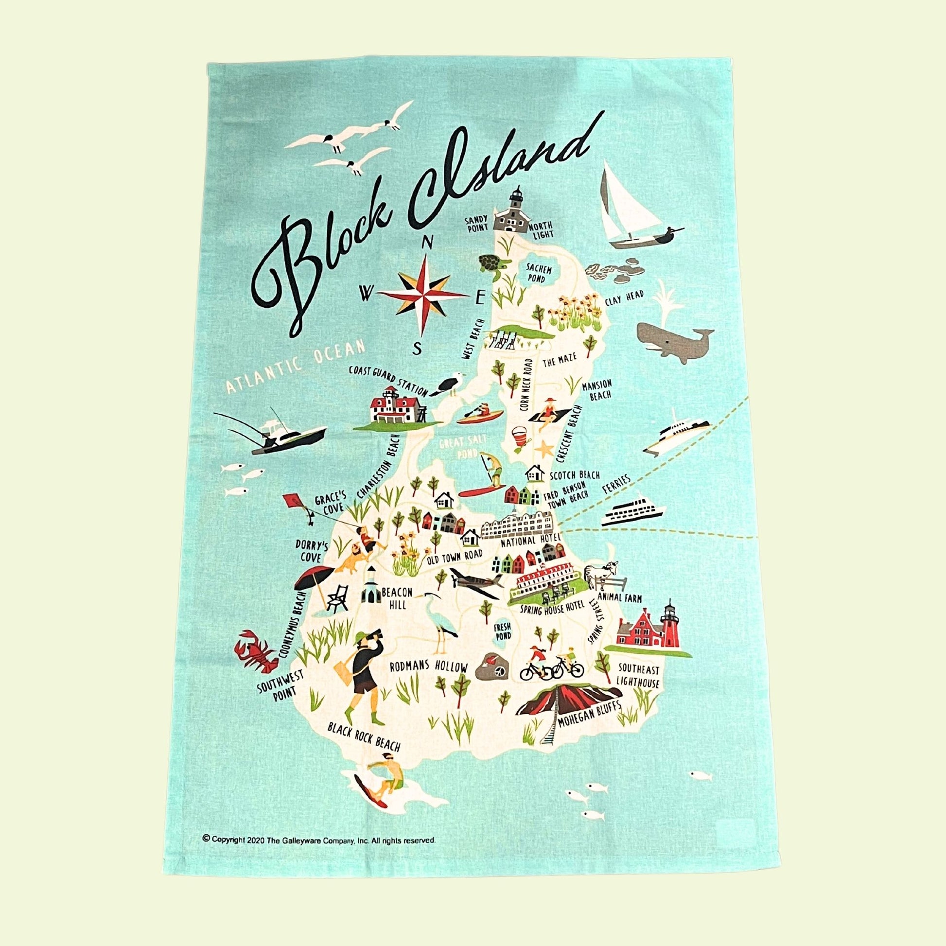 This Block Island tea towel is a beautiful and practical addition to your kitchen! It features an artistic rendering of Block Island’s most famous landmarks, from Mohegan Bluffs, Black Rock Beach, Crescent Beach, North Light and Southeast Lighthouse.