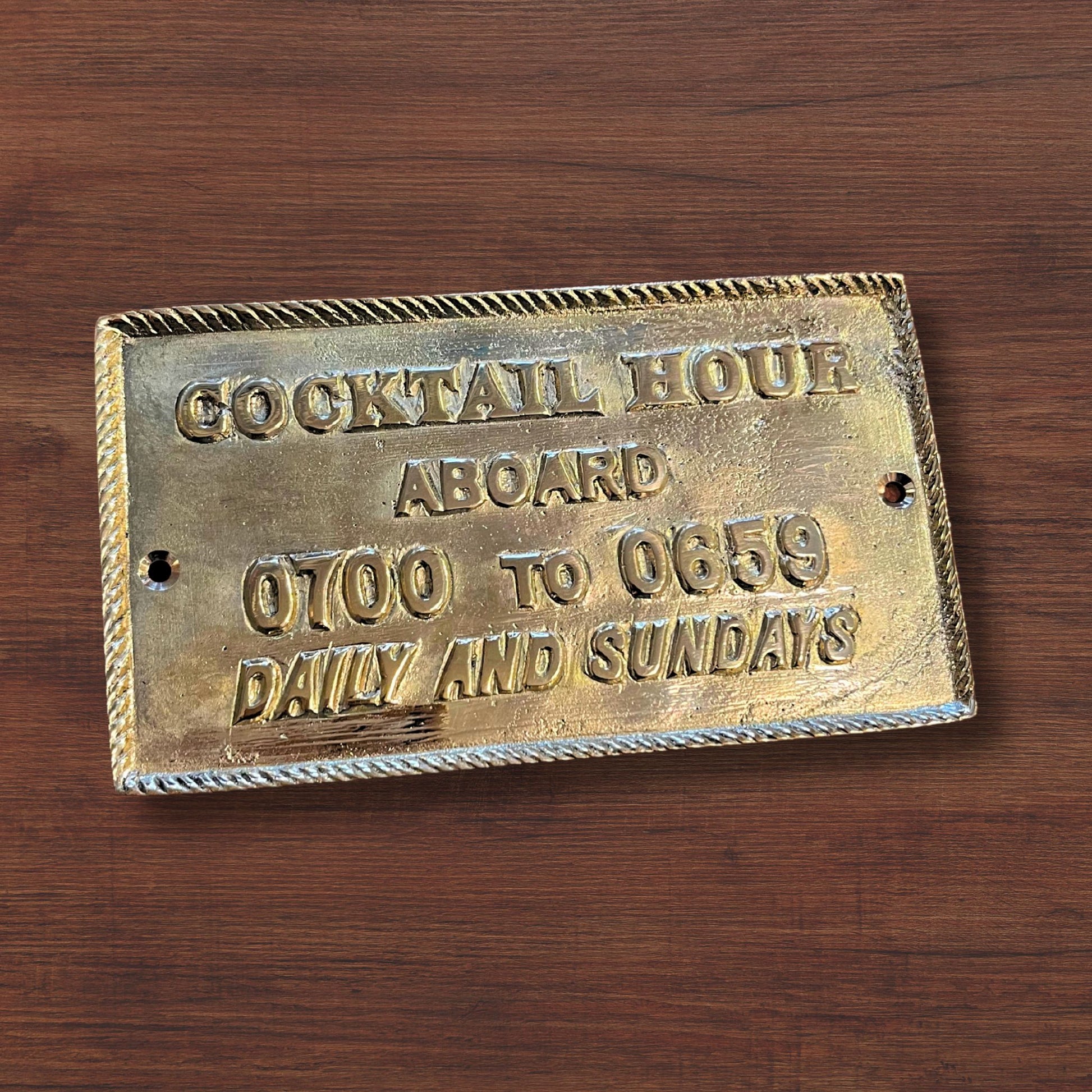 Declare every hour 'cocktail hour' with this whimsical decorative plaque. Crafted from brass, it features the tongue-in-cheek phrase "Cocktail Hour Aboard 0700 to 0659 Daily and Sundays". Hang it in your home and raise a glass to seeing the glass as half full!