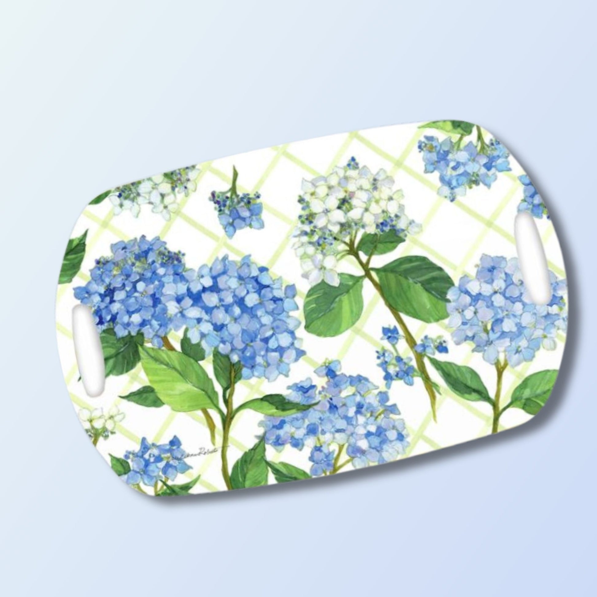Looking for a beautiful yet functional outdoor mealtime solution for the summer? Look no further. Our elegant hydrangea bamboo serving tray offers durability and coastal New England charm. This is large enough to hold nibbles and drinks. Crafted with a graceful pattern of blooming hydrangeas, it's perfect for a picnic or a boat ride. Enjoy many al fresco meals for seasons to come with this beautiful tray. the handle makes it easy to carry and reduces the chance of drops and spills. Pat yourself on the back for making an eco-friendly choice and keeping disposable plates out of landfills!