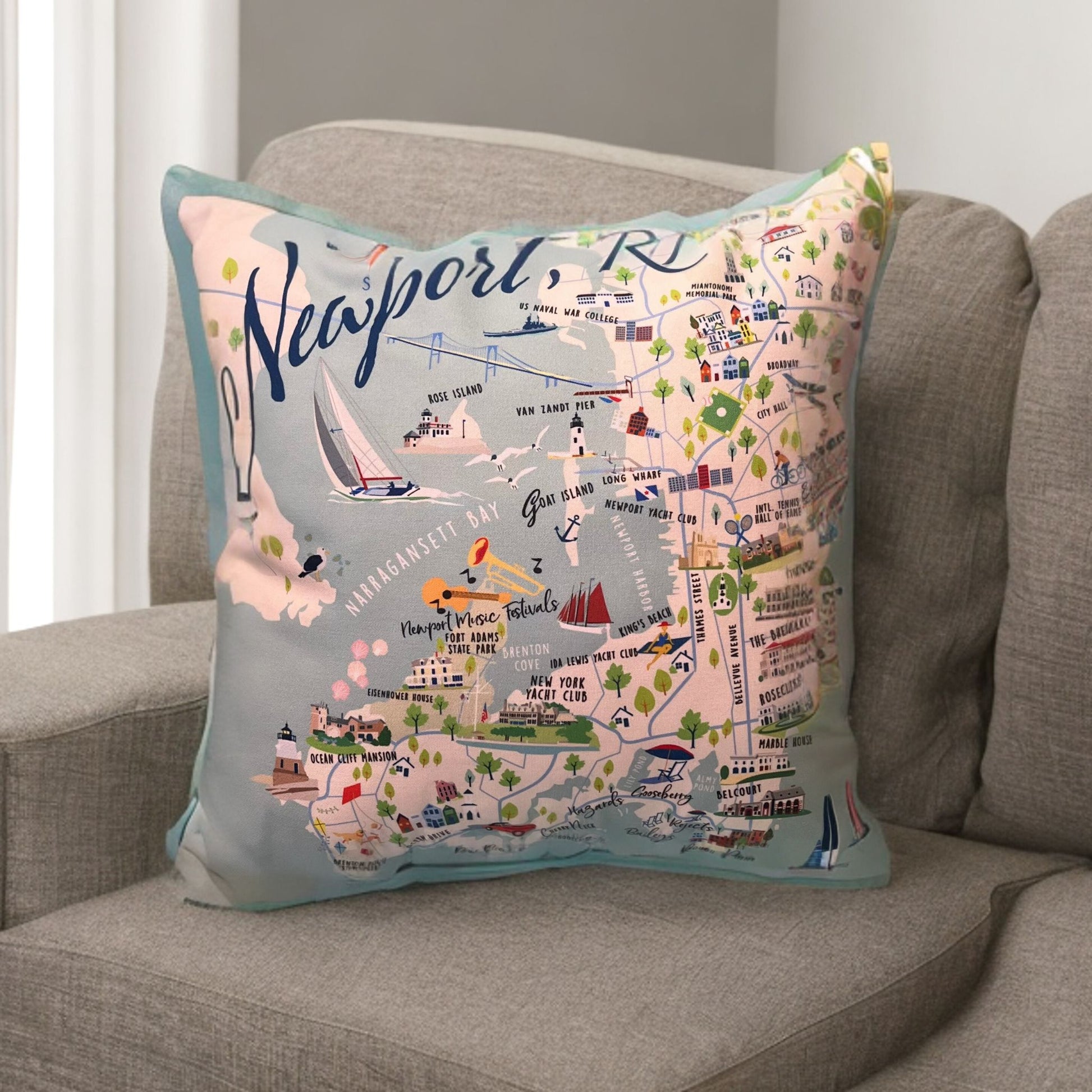 This Newport, Rhode Island decorative pillow is a beautiful and practical addition to your home! It features an artistic rendering of Newport, showcasing some of the city's most iconic landmarks. It features sailboats, the Pell Bridge, Ocean Drive, and some of the city's most famous beaches. Additionally, the downtown area's landmarks, including Newport's historic mansions and charming wharves are also featured in this artwork. This would look fantastic on a couch, a guest bedroom, a nook or even an entryway bench.