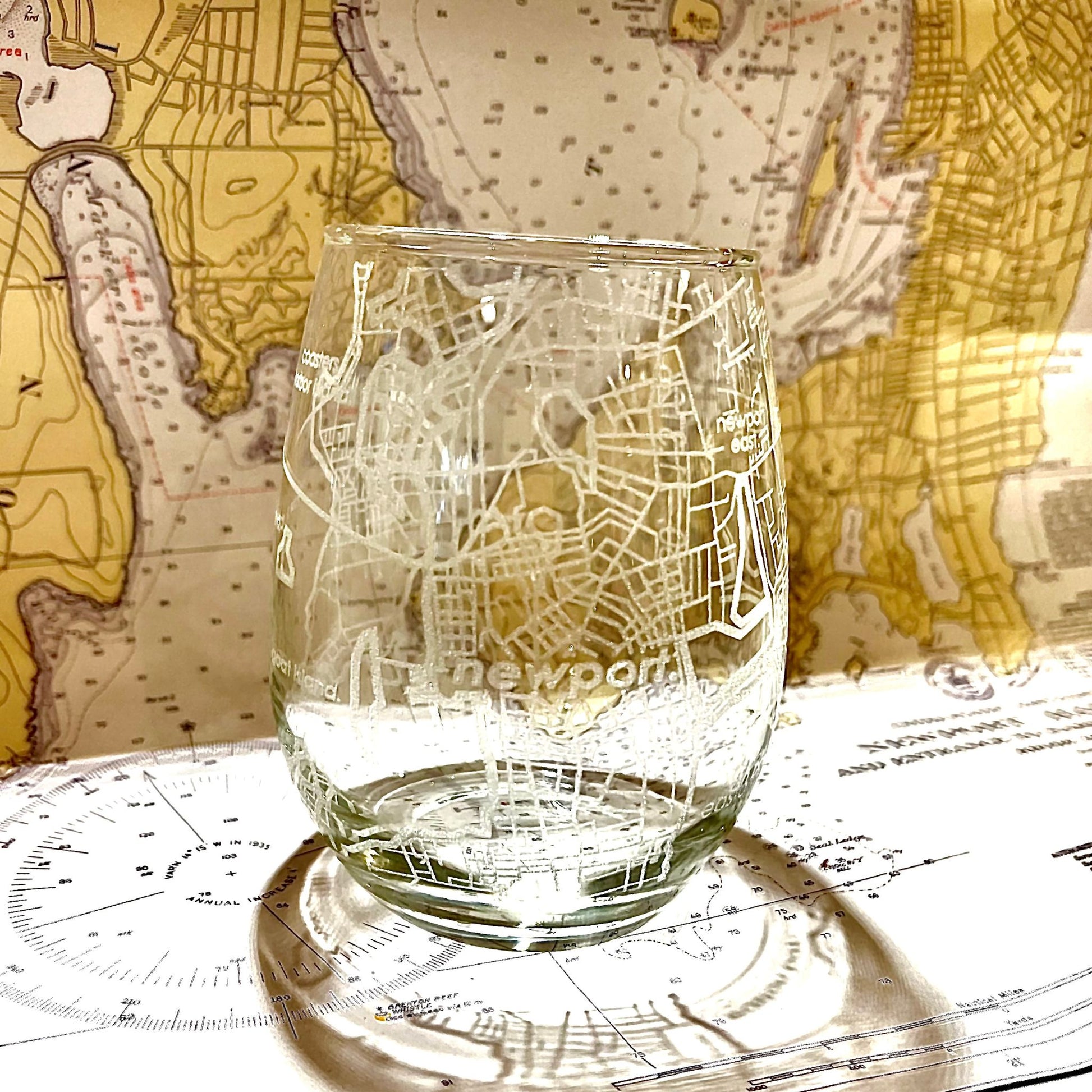 Our exquisitely detailed etched stemless wine glass features a map of Newport, RI, one of America's most historic and charming coastal cities. This glass is perfect for anyone who loves spending time in the City-by-the-Sea nestled in Narragansett Bay.