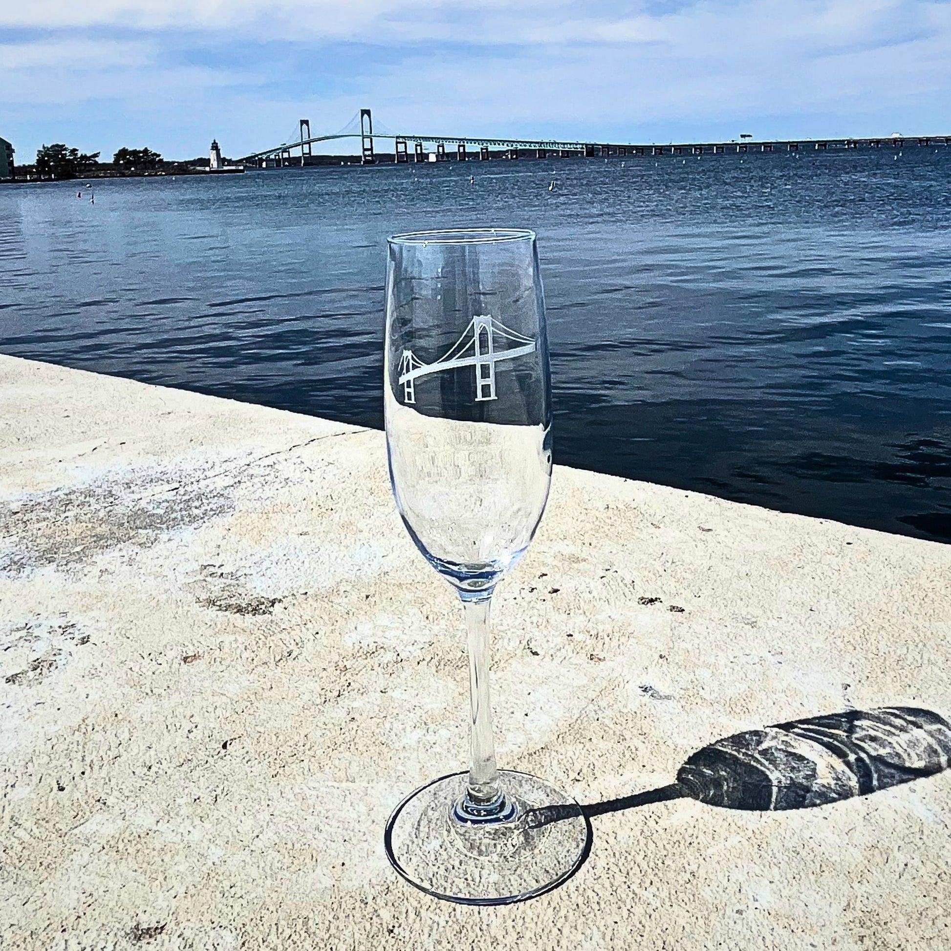 Our exquisitely crafted flute glass features an etched impression of the Newport, RI Pell Bridge. This glass is the perfect addition to any wine lover's collection and it will remind you of relaxing days spent on Aquidneck Island. The design is a tribute to the beauty of Rhode Island and the iconic landmark bridge that connects Newport to Jamestown. This glass is the perfect way to show your love for the area and share it with others. It would also be more than fitting for a Newport, RI wedding or engagement.