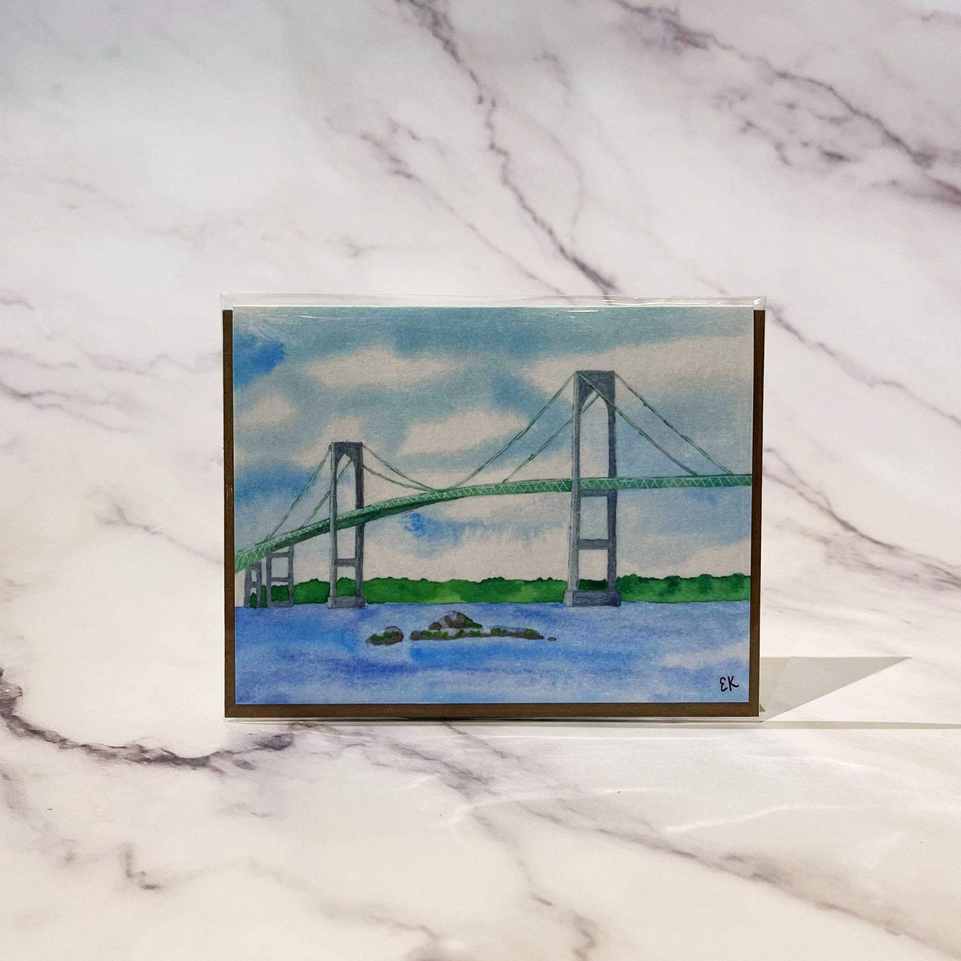 Local artist Eileen Pollina's artistic eye has expertly captured the beauty of Newport's Pell Bridge with her watercolor. Her artwork has a unique and charming quality that is instantly recognizable. Each card is printed on high-quality paper that feels like watercolor paper, ensuring that the colors and details of the artwork are rich and vibrant.