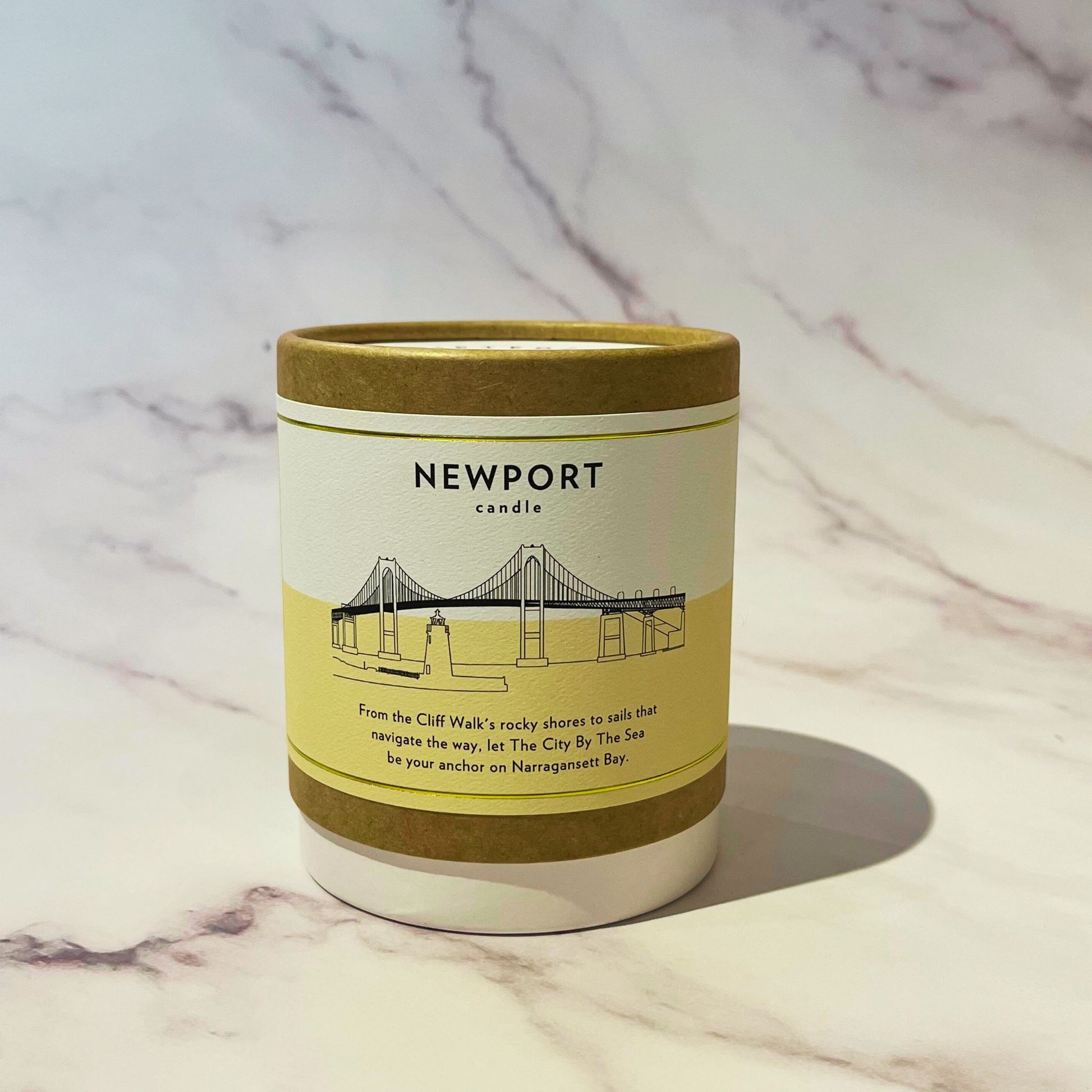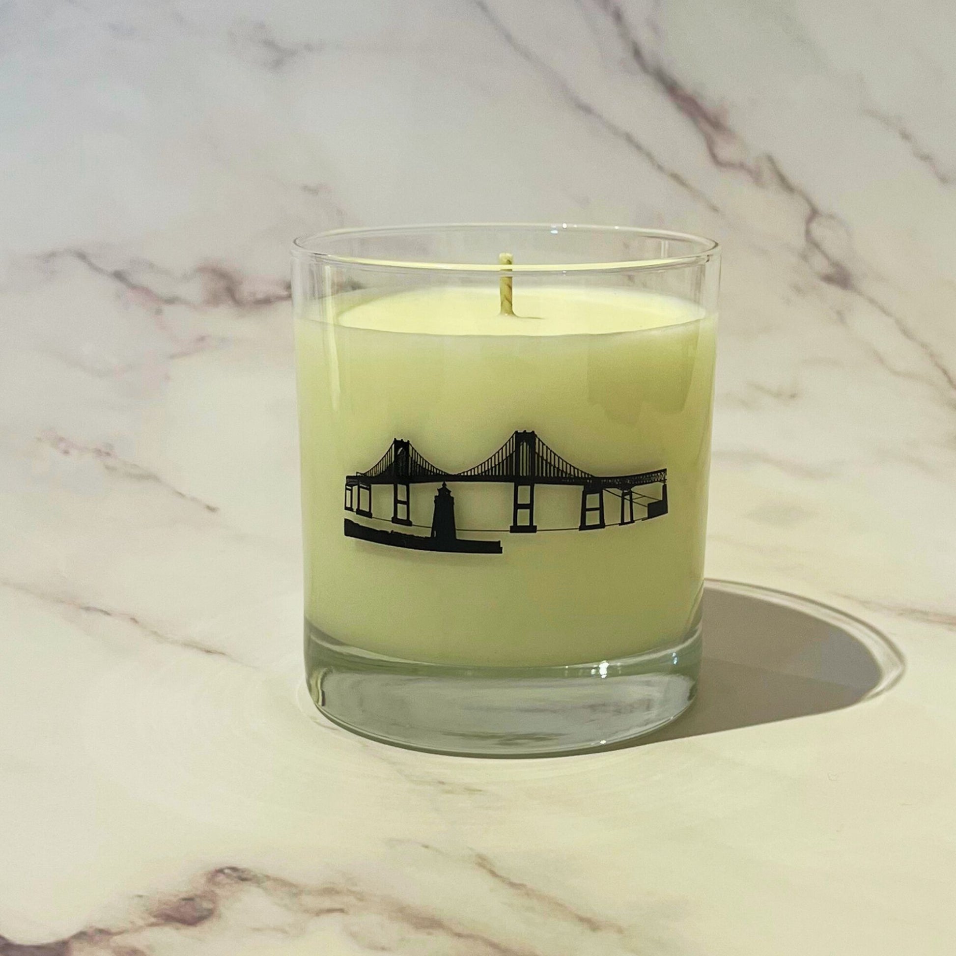 Our beautiful soy candle features a stunning graphic image of the Newport Bridge and the Goat Island Lighthouse! This candle not only fills your space with a warm, inviting fragrance, but also brings you back to days on Aquidneck Island to any room with its unique and eye-catching design. The scent is a light and pleasant aroma of ocean waves and lemongrass.