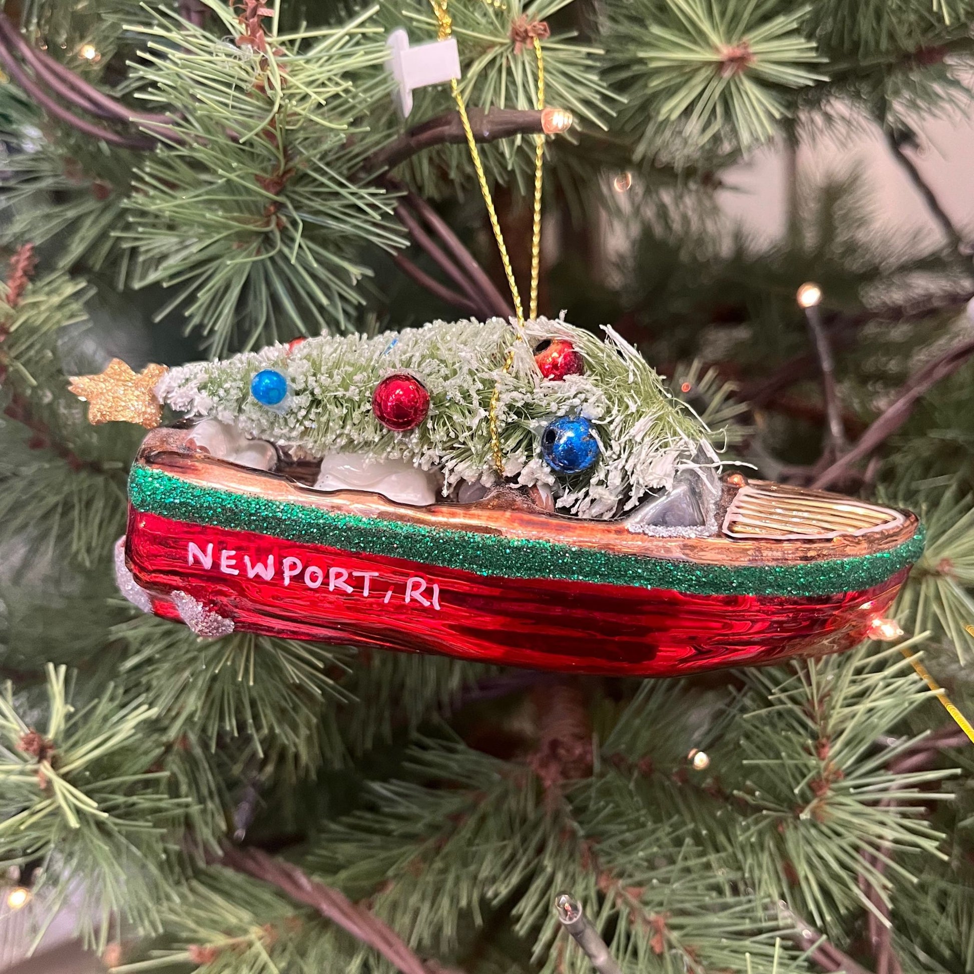 Remember fun memories in Newport, RI every holiday season with this unique and festive runabout boat ornament! Newport, RI is written on the sides, and a beautiful Christmas tree with "snow" and ornaments is laid down on top for the perfect holiday touch. The yar, 2023, is written on the back.