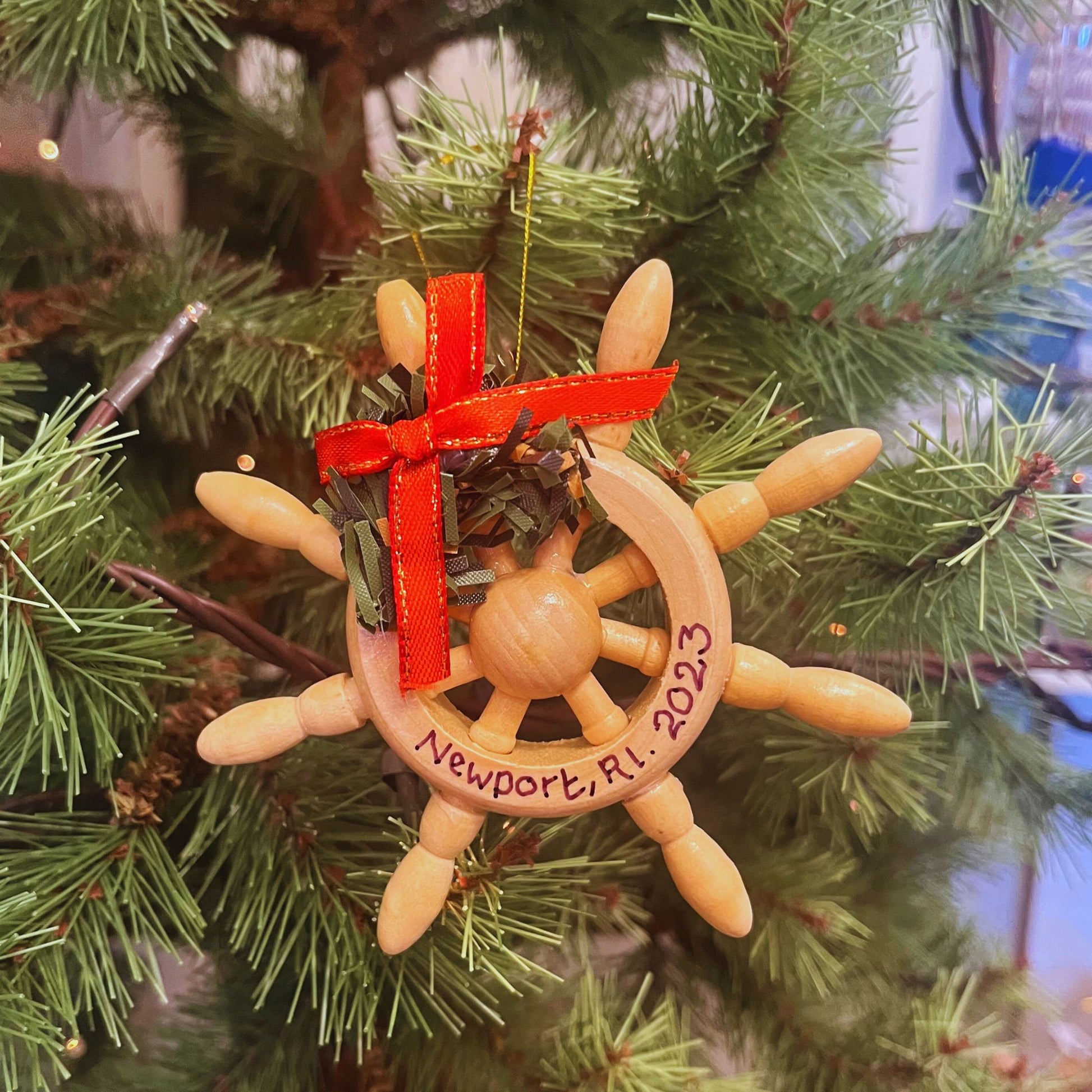 The top of the ornament features a beautiful bow, adding an elegant touch that's sure to catch the eye. And with "Newport, RI 2023" written on the wheel, this ornament is the perfect way to commemorate your visit to this beloved coastal town.