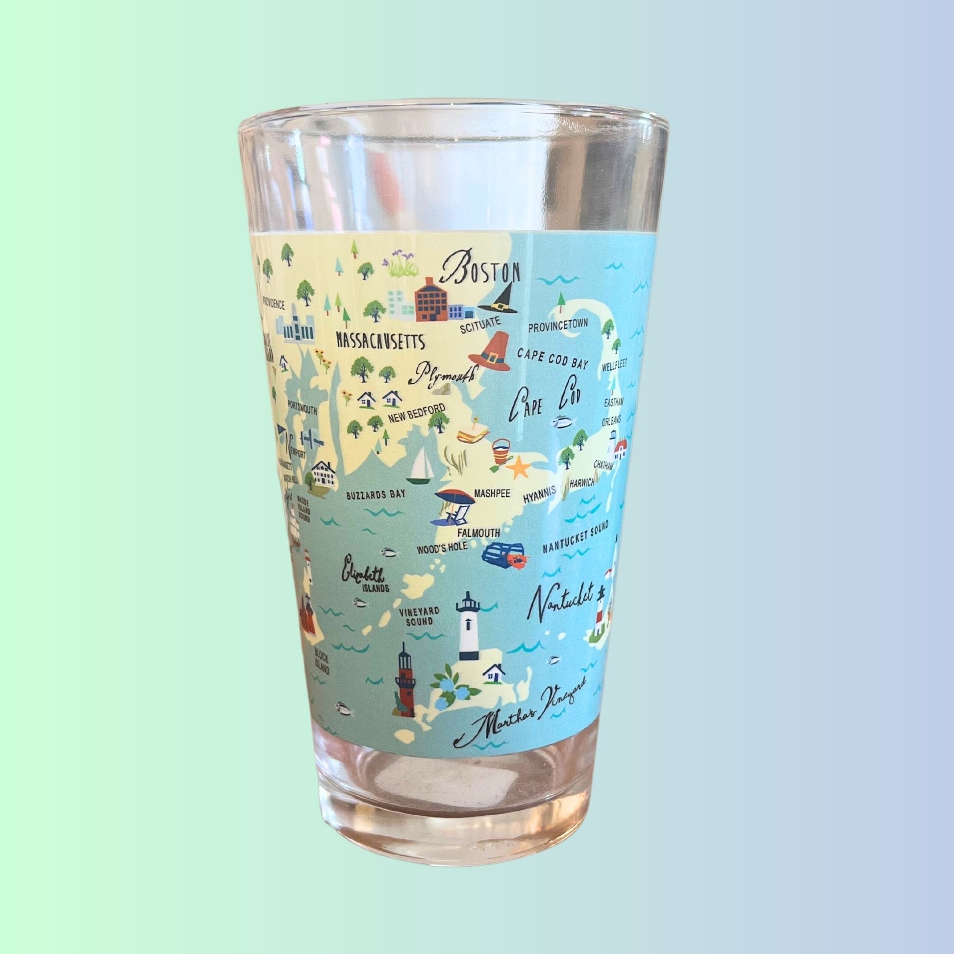 This Northern Shores pint glass is a beautiful and practical addition to your collection! It features an artistic rendering of southern New England from CT to RI all the way to Cape Cod. It features famous locations such as Newport, Mystic, Montauk, Nantucket, Martha's Vineyard, Cape Cod and Boston.