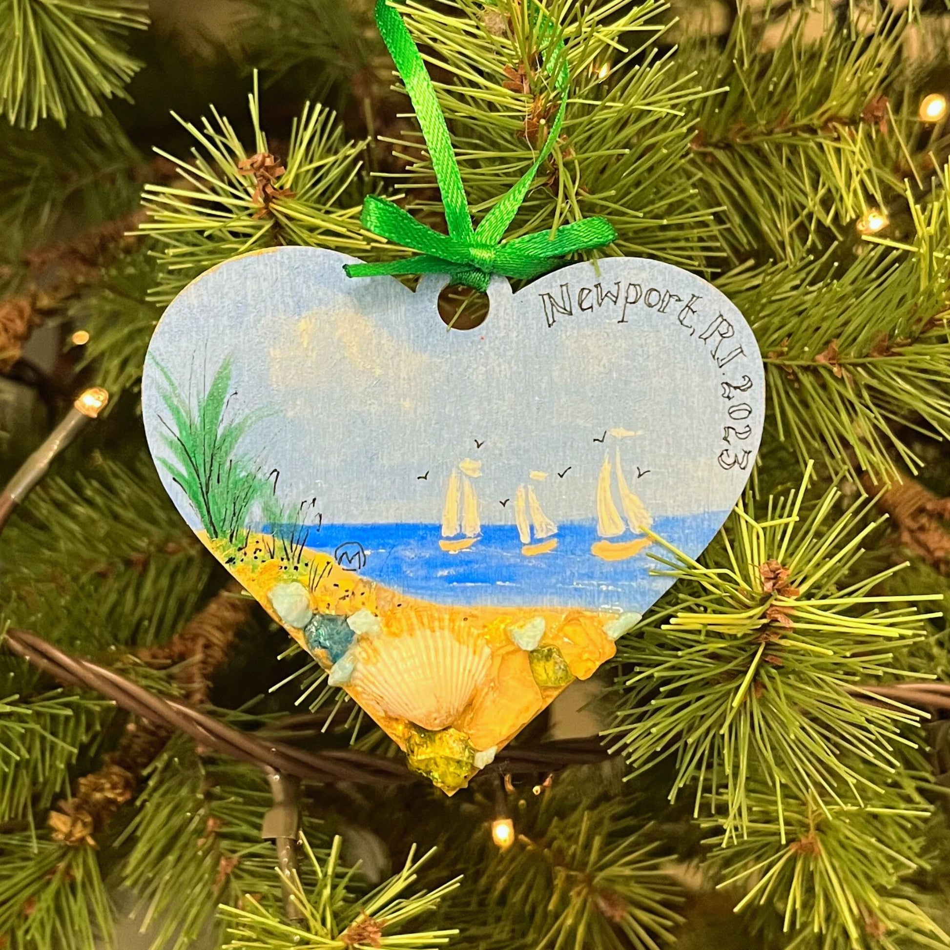 Our exquisite wooden ornament captures the heart of the sailing heritage in Newport, RI. Each piece is a one-of-a-kind made by the creative hands of Melanie O'Callaghan, a local Newport artist. It is meticulously hand painted and adorned with sea glass and shells found along the shores of Newport's iconic beaches. Whether you are near or far, seeing this on your Christmas tree, or as a decoration in your home will transport you to the tranquil shores of Newport, Rhode Island.