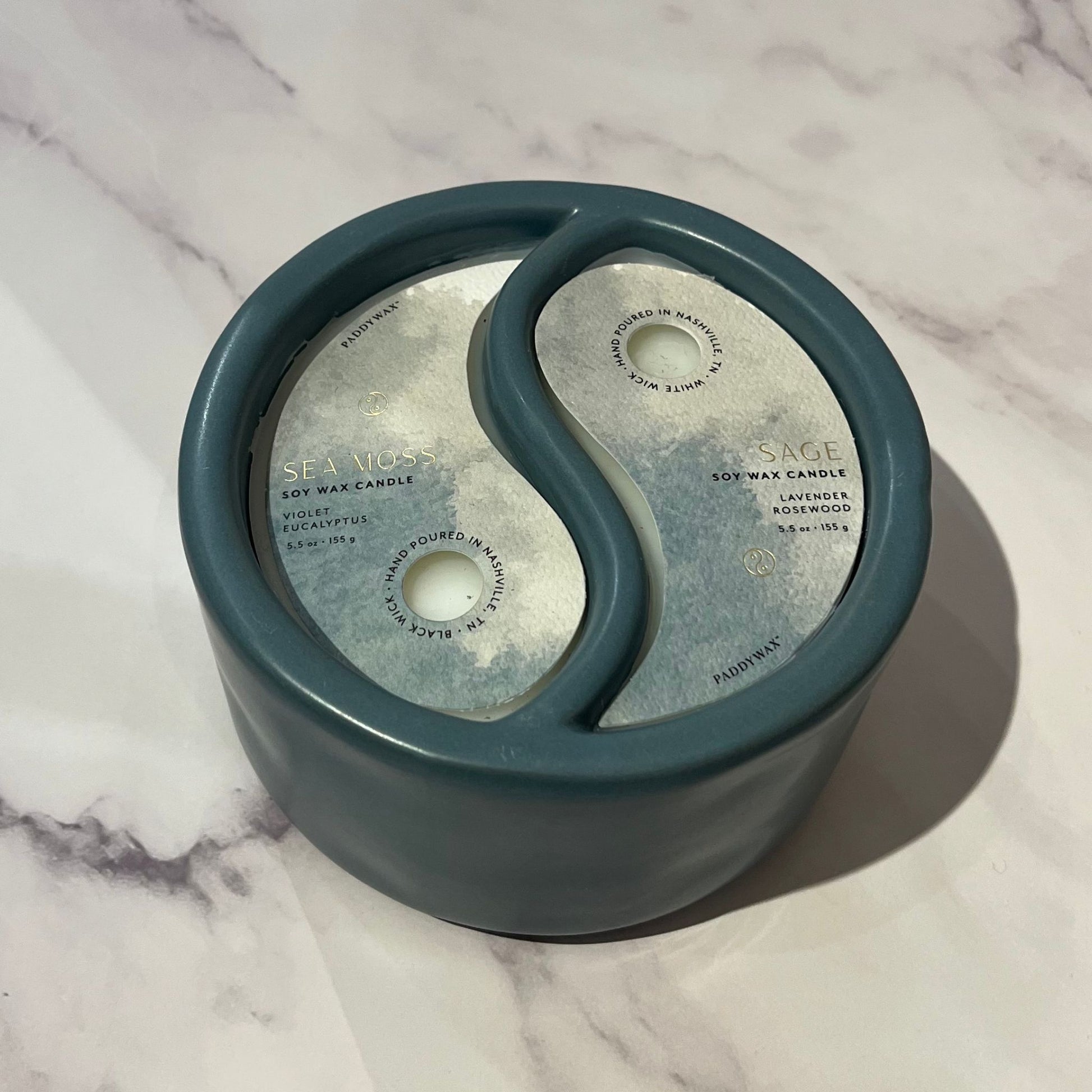 Our unique 11oz yin yang shaped soy candle has two distinct zones - one side featuring a soothing sea moss scent and the other, an earthy sage aroma. This candle is a perfect way to create balance and harmony in your home. The yin yang shape of the candle is not only a symbol of balance and harmony but also an elegant addition to your home decor.